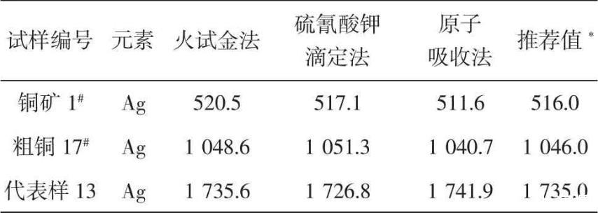 按試驗(yàn)方法,用不同含量的銅物料樣品進(jìn)行分析,并與其它測(cè)定銀元素方法的分析結(jié)果對(duì)照,結(jié)果見(jiàn)表4。