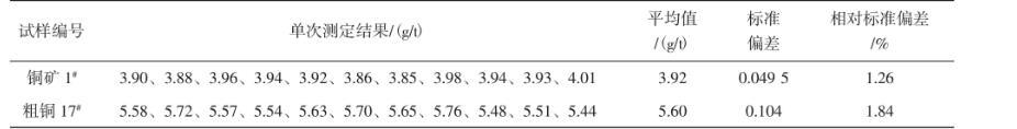 稱(chēng)取20.00 g樣品,銅礦、銅渣樣直接干法試金配料,按試驗(yàn)方法進(jìn)行分析,結(jié)果見(jiàn)表4和表5。