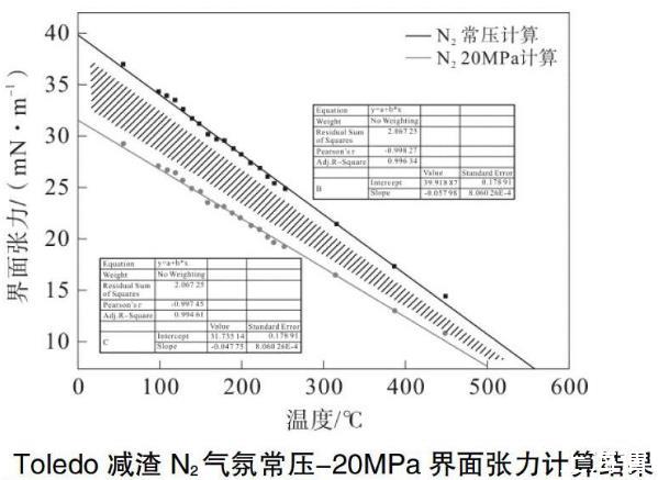 可以看到,根據(jù)文獻(xiàn)方法計算結(jié)果,對于Toledo減壓渣油來說,其在常壓條件下N2氣氛條件下的氣液界面的界面張力,當(dāng)不在真臨界溫度(760℃)較近的溫度范圍內(nèi),都可以認(rèn)為隨溫度呈現(xiàn)線性下降的趨勢。