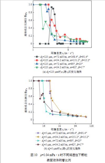總結了霧滴—塵粒碰撞過程會發生的“反彈”、“完整聚并”、“包裹后撕裂”、“膜狀飛濺”4種行為類型,并發現碰撞后顆粒表面的液體附著比例變化曲線的轉折點與相應的碰撞行為密切相關。